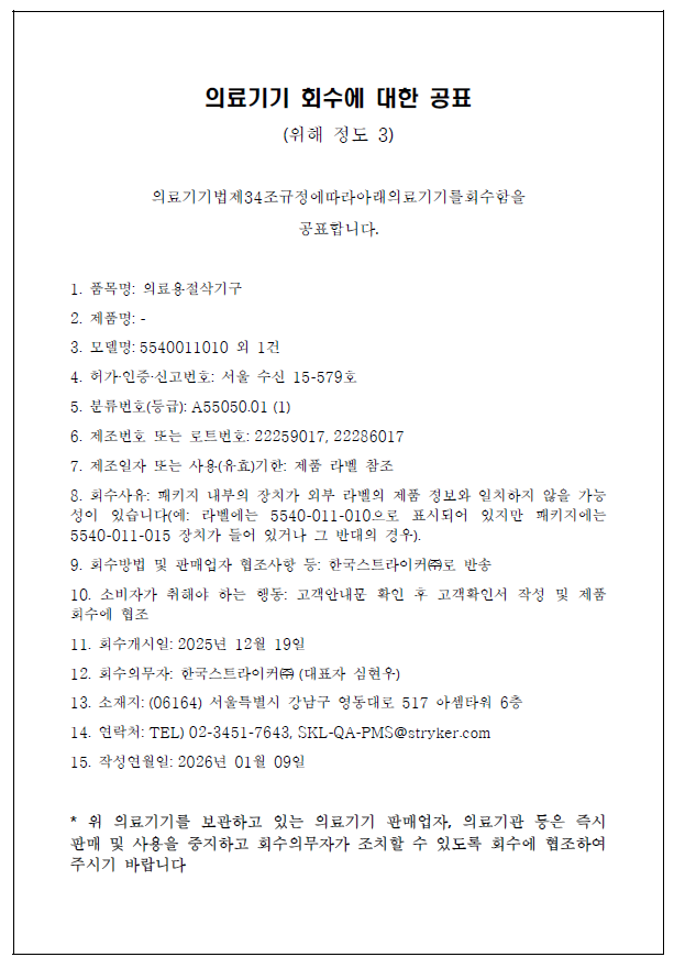 한국스트라이커 자발적회수 계획 공지