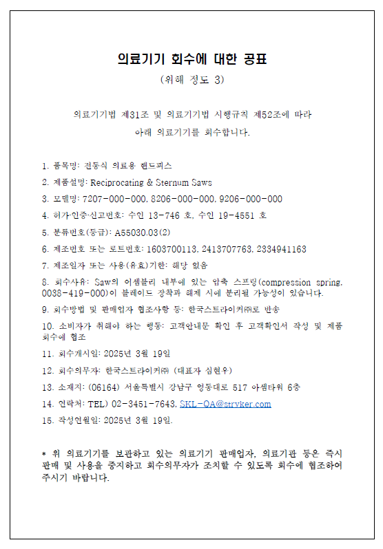 한국스트라이커 자발적회수 계획 공지