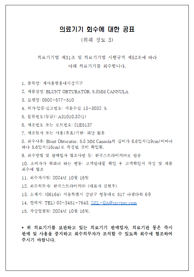한국스트라이커 자발적회수 계획 공지